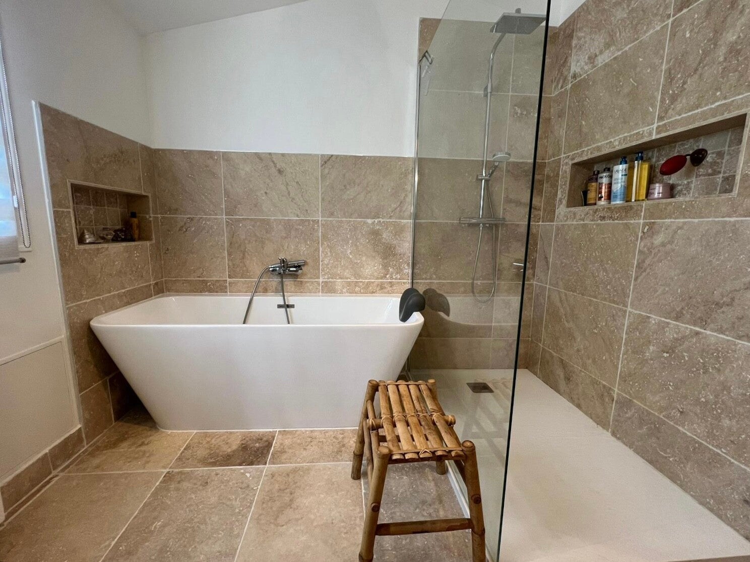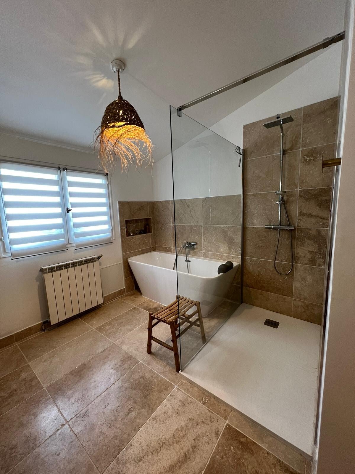 À la demande de notre cliente, nous avons utilisé du carrelage en travertin qui est un revêtement de sol et/ou de mur intérieur et extérieur en pierre naturelle, originaire principalement d'Italie.